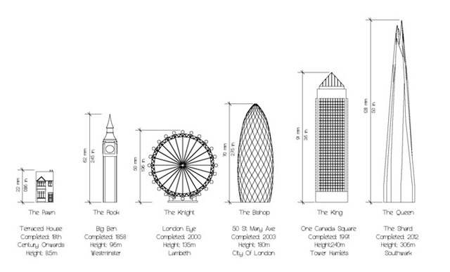 Each piece was created considering its architectural and symbolic value for the city as well as its value on the chessboard. Thereby the pawn is shaped after the traditional London’s terraced house; the bishop owes its form to the building known as the "gherkin" designed by the architect Norman Foster; the knight is played by the London Eye wheel; the rook corresponds to the iconic Big Ben; the Queen is played by the most dominant building in London skyline, the Shard of Glass by Renzo Piano; and the King is played the majestic Canary Wharf.