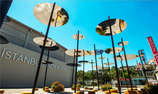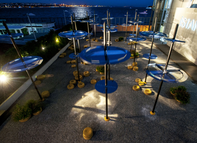 The "Sky Spotting Stop" takes its name from the title of a poem by "Goge Bakma Durağı" (Stop to look at the sky). This new lounge urban space seems to float gently over the waters of the Bosphorus, projecting lights and shadows in the courtyard of Istanbul Modern, reflecting the light and wave motion on the ground and on the facades of the museum. The patio becomes part of the horizon through this vibrant installation, which is visible both from the Bosphorus and the highest points of the city.