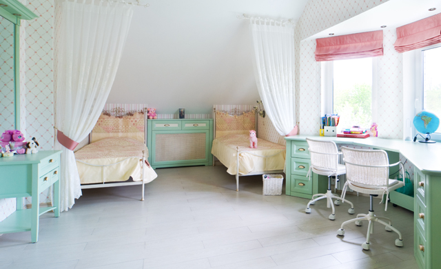 I only recommend bunk beds if the room is too small, or else opt for beds with drawers. If the room is shared by two children is preferable to have the beds side by side, with the headboards against the wall. And if possible, choose furniture with rounded corners.