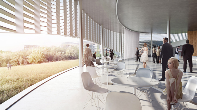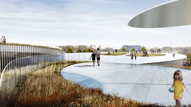 "Like the mixture of two incompatible substances – oil and vinegar – the urban pavement and the parks turf flow together in a mutual embrace forming terraced pockets overlooking the park and elevating islands of nature above the city. A series of seemingly singular pavilions that weave together to form a unified institution – like individual fingers united together in a mutual grip”, explains Bjarke Ingels.