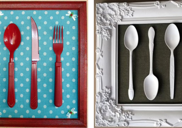 An easy and funny suggestion is to glue some cutlery at the base of a frame without glass. You can leave them in natural colors or spray them. This will give a twist to your dining area!