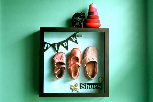 If you are looking for truly unique wall art, try using unexpected items, such as shoes, and put a frame around them. Imagine having your child growing process displayed to the wall through their shoes!