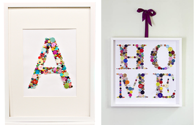 Try using some simple objects, like colorful buttons, to make some interesting pieces. Cut out the shape of a letter, draw it on the base of the frame and glue the buttons within the limit of the letter.