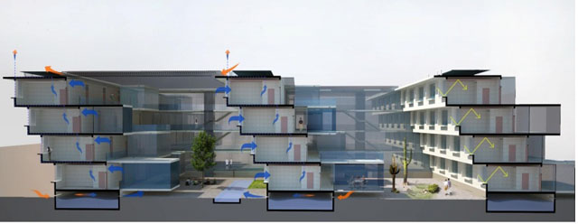 As the cactus open their stomas during the night to allow photosynthesis, the building comprises several courtyards that are closed during the day and open during the night for ventilation and cooling purposes, ensuring a greatar temperature stability.