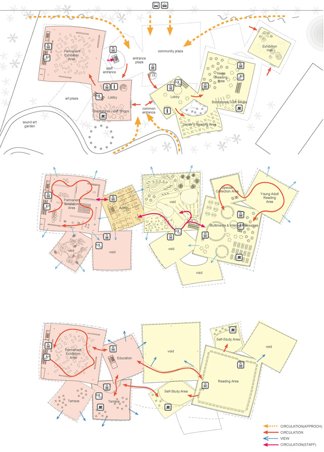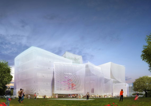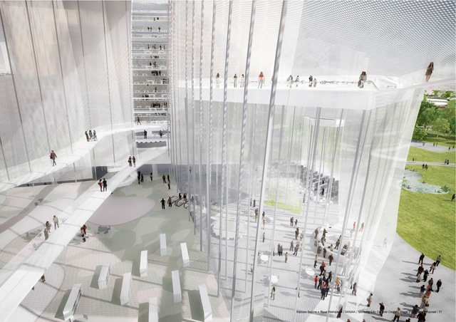 The winning proposal combines multiple volumes consisting of distorted cubes involved in a translucent mesh, forming angles between them and overlaying in access areas connecting to exhibition spaces, libraries and reading areas.