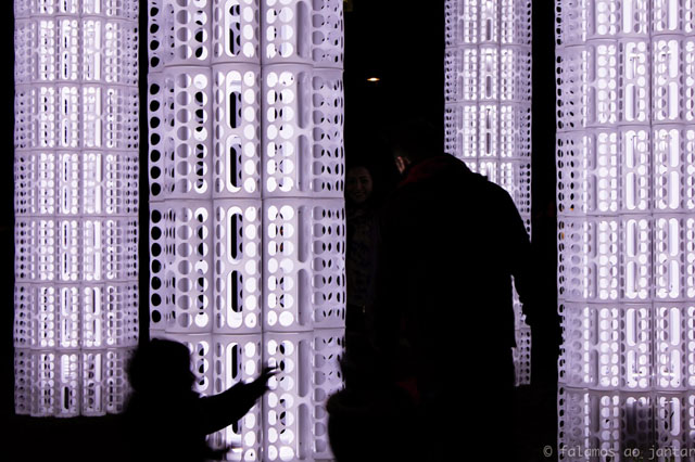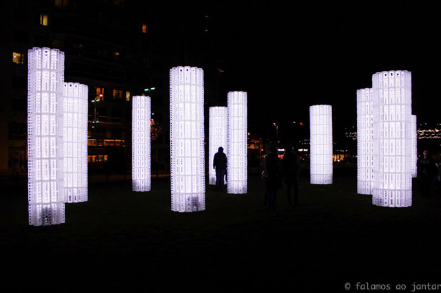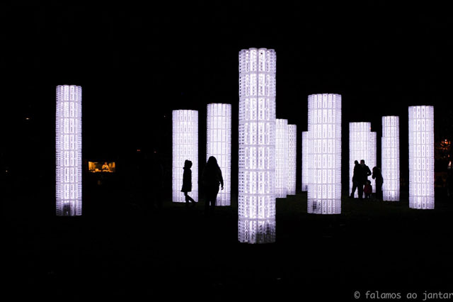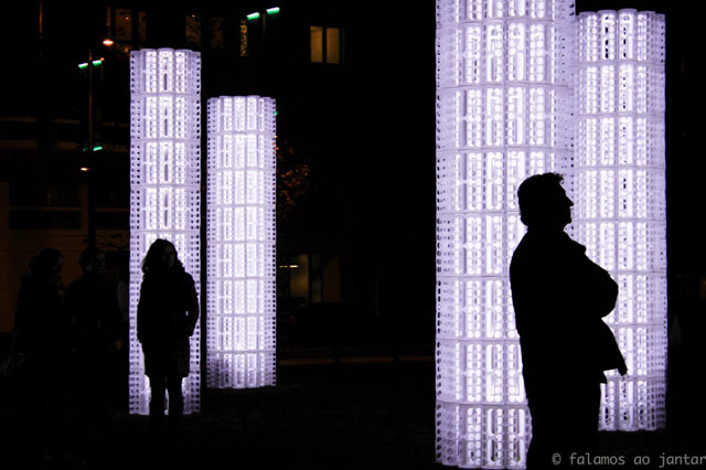 This light installation, designed by the young Portuguese LIKEarchitects, consists of a series of "trees" made from 1,296 dispensers of plastic bags (Rationell Variera, IKEA), illuminated with low energy consumption LED lights connected to car batteries.