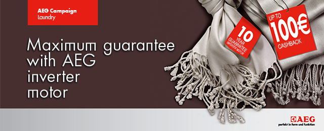 On the purchase of a washing machine, washer and dryer or dryer with «inverter» motors, AEG offers up to 100 euros cashback and a 10 year guarantee on «inverter» motors.