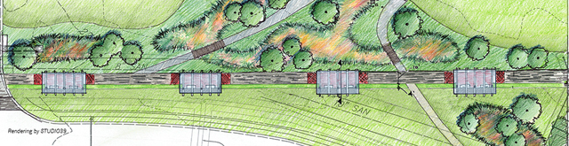 The plan is based on sustainable solutions that include 100% native plant materials, multiple rain gardens, permeable pavements, bioswale, solar voltaic panels and rainwater collection from trellis roofs with photovoltaic panels, which besides producing energy allow collecting rain water.