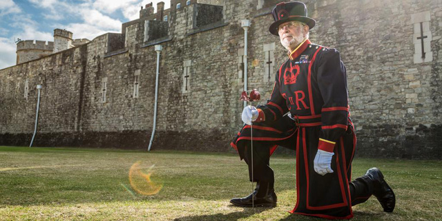 This art installation titled "Blood Swept Lands and Seas of Red" was created by artist Paul Cummins and the set designer Tom Piper, and uses 888,246 poppies ceramic to create a blood-red moat around the fortress, paying tribute to soldiers who lost their lives in the First World War.