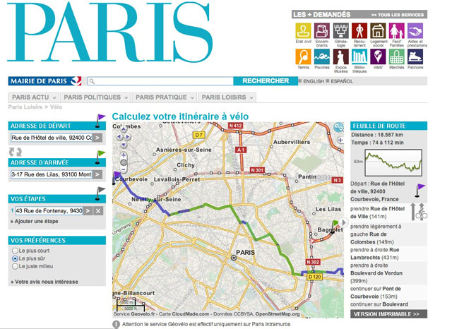Cities like Paris currently have a wide range of public services to facilitate transportation by bicycle. The Municipality of Paris's own website provides a portal to answer questions of residents and tourists with maps, road maps, route simulators, tourist tips and recommendations of conduct for cyclists on public roads.